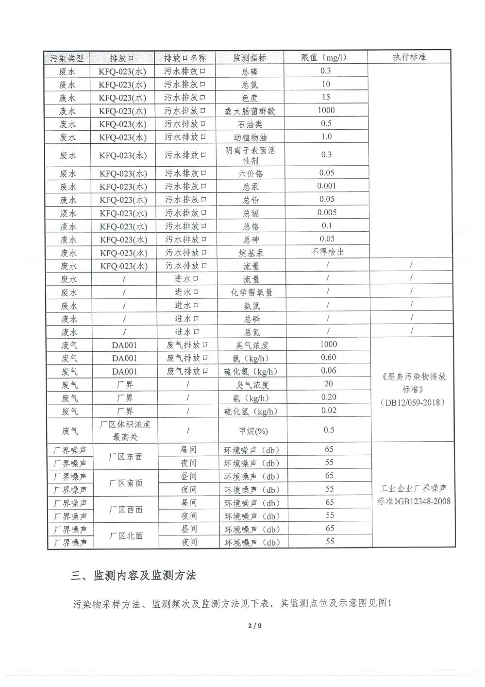 PH 6.29 6-9 90 100 COD 21.39 30 90 100 BOD5 3.00 6 90 100 SS 2.84 5 90 100 TP 0.17 0.3 90 100 TN 6.63 10 90 100 NH4-N 0.47 1.5(3.0) 90 100 色度 2.00 15 90 100 糞大腸菌群 31.56 1000 90 100 石油類 0.07 0.5 3 100 動(dòng)植物油 0.03 1.0 3 100 陰離子表面活性劑 0.14 0.3 3 100 六價(jià)鉻 0.012 0.05 1 100 總鉻 0.015 0.1 1 100 總鎘 0.0015 0.005 1 100 總砷 0.0008 0.05 1 100 總鉛 0.015 0.05 1 100 總汞 0.00029 0.001 1 100 出水達(dá)標(biāo)率100% 2026年1季度 排放量(噸) 1 化學(xué)需氧量 2 氨氮(NH3-N) 3.51 3 總氮(以N計(jì)) 49.52 4 總磷(以P計(jì)) 1.27 3.防治污染設(shè)施的建設(shè)和運(yùn)行情況