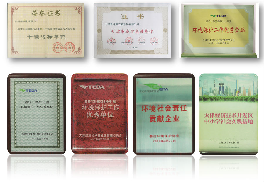 公司自成立以來,蒞年榮獲由中國城鎮(zhèn)供水排水協(xié)會、泰達環(huán)境保護協(xié)會、開發(fā)區(qū)管委會、泰達控股有限公司等機構(gòu)頒發(fā)的各類先進榮譽共20余項,得到了天津市和開發(fā)區(qū)環(huán)保局、開發(fā)區(qū)管委會及合作股東的認(rèn)可。